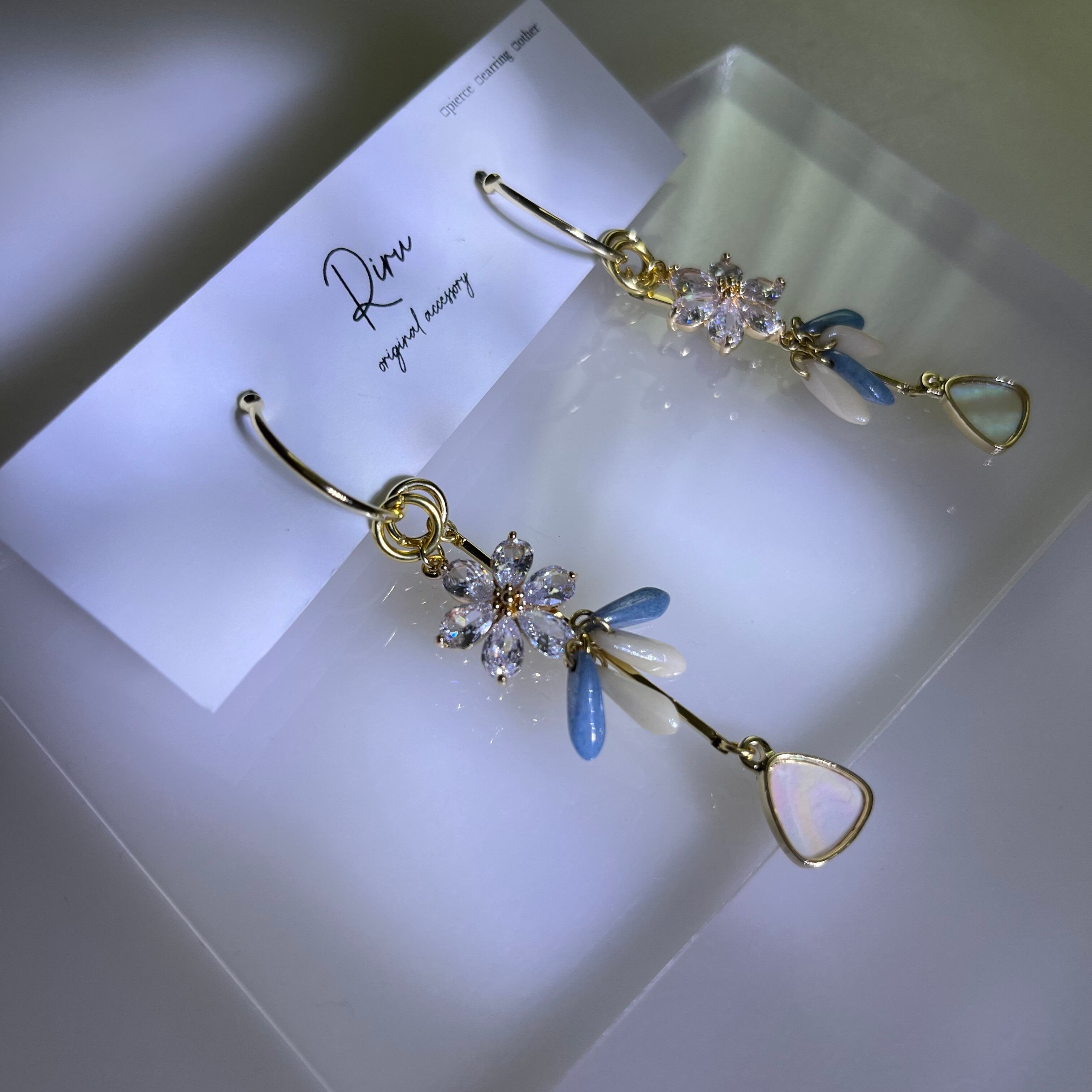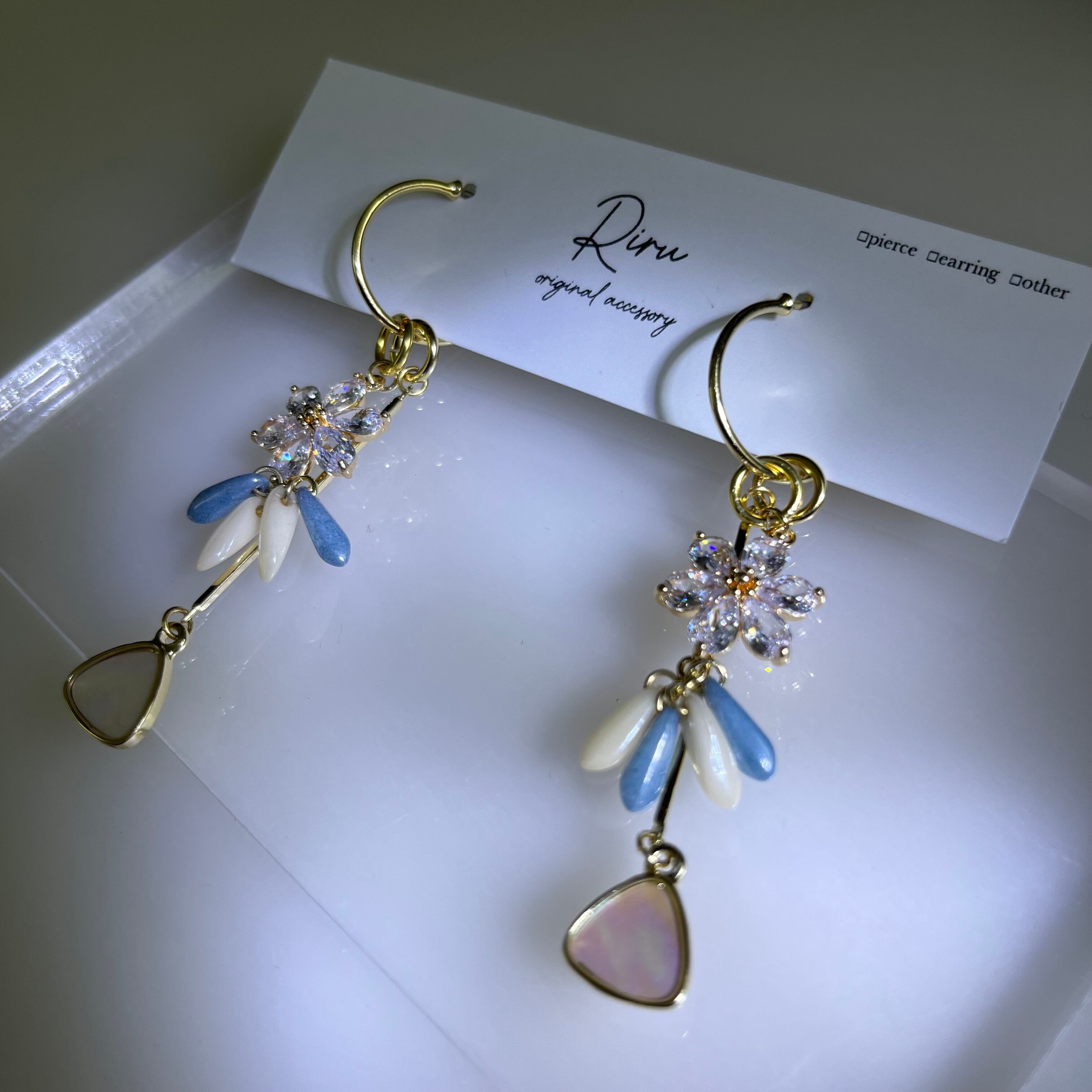 zircon flower 2way ピアスはチェコガラスをぶら下げたジルコンのフラワーチャームとシェル模様のトライアングルチャームを使用したピアスです❤️